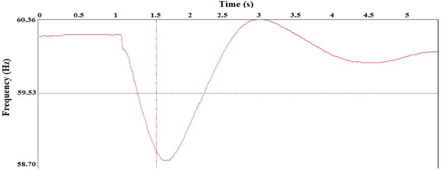 The behaviour for both synchronous generator technologies is very similar. The frequency of oscillation is around 0,35 Hz, corresponding with modes 39 and 40 shown in table 1. In this case, these modes are the dominants and correspond with the excitation system of MAN generators. In order to check this behavior a comparison is make with a real life event occur in the system under study. Figure 3, shows the frequency response of the system against a disturbance. The real frequency of oscillation in the system is around 0,34 Hz, which is also the range shown by eigenvalues analysis. The difference with the simulation is less than a 3%, therefore, the system behaviour and models are validated and the system is ready for the small signals analysis with wind turbines.