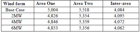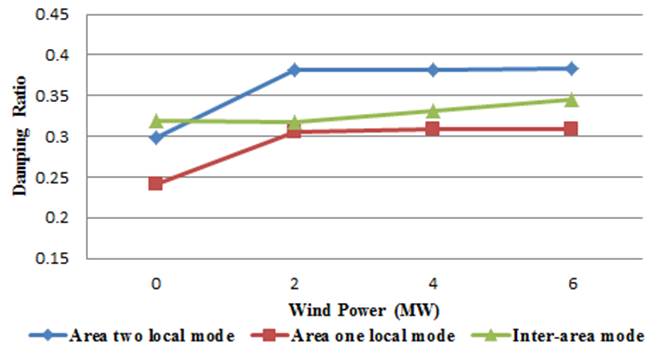 The damping of area two is the same when the wind farm is up to 10 MW, notes that the wind farm is interconnecting to the system in area two; in some way the wind farm integration in this area substitute the damping lose for the disconnection of diesel generators. The inter-area damping is slightly increased up to 0,34.