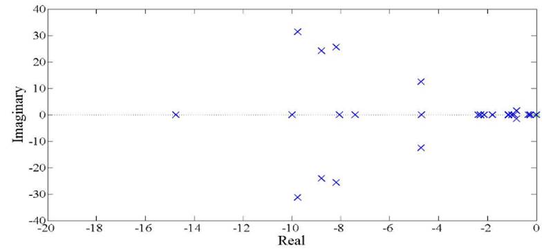The system under study is an isolated distribution radial system with a maximum load of 17,7 MW and 6,2Mvar. This load is only supplied by dispersed generation technology. Four 4,5 MVA MAN diesel generators connected at bus 2 and 3, and four 2,36 MVA MTU diesel generators dispersed in the system supply the loads. The main functions of MTU generators are the improvement of quality service and to support the MAN generators at maximum load condition. The distribution system has a voltage level of 34,5 kV and seven distribution substations. System without wind power integration is a base case. In [17], data related with this system is presented. The data related to diesel generators models and the automatic voltage regulator model of MAN technology is according with [17].The base case eigenvalues are computed and 68 eigenvalues with negative real part value are obtained. Some of the most important are shown in figure 1.