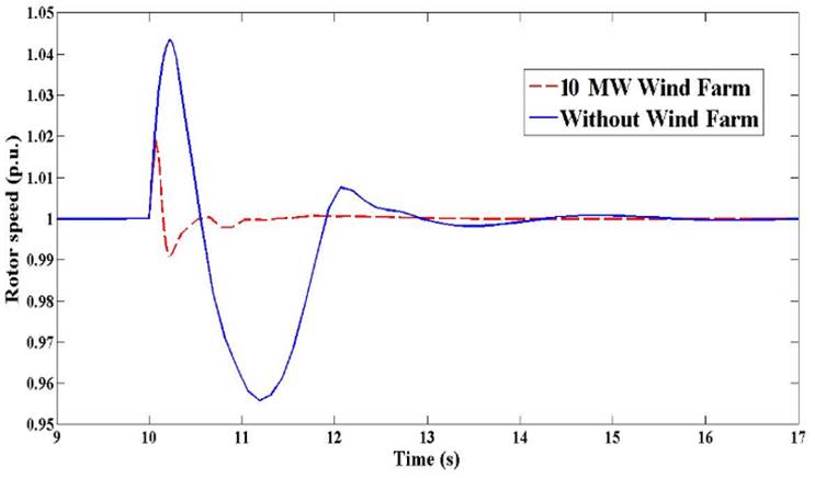 In order to check the behavior of synchronous generators with the integration of wind energy a time domain simulation is carried out. The analysis was making for the most critical condition; correspond with the second scenario, in other words, the scenario when the diesel generators was disconnected in behalf of wind turbine integration. In this case, the wind farm is 10 MW and represents the bigger wind penetration in all studied cases. For the analysis a three phase short-circuit fault was applied at bus 8 and cleared after 70 ms. The rotor speeds of MAN generators were observed at figure 6.