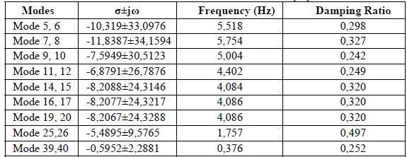Since all the eigenvalues lie on the left side of the imaginary axis, the system is asymptotically stable. Nine of the eigenvalues are complex, denoting an oscillatory mode. Only the results of the oscillatory mode are shown in table 1. It is interesting to note that the oscillatory frequencies of seven of the nine modes are between 4 and 6 Hz, which is more than the frequency of electromechanical modes of large generators observed in transmission systems, which typical values are between 0,1 and 2 Hz [16].