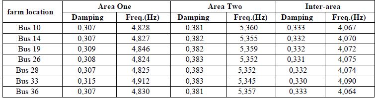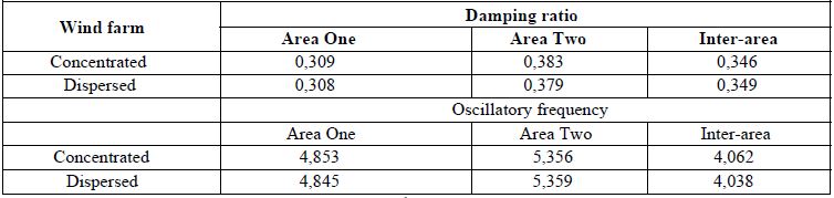 A decrease in the frequency of the oscillation in area one from 5 to 4,28Hz (15% of reduction) is observed. In area two, the reduction of the oscillatory frequency was 5%, while the inter-area mode frequency is mostly the same for all values of wind farm integration.