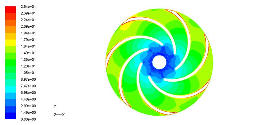 Continuando su recorrido, las líneas de corriente pueden ser apreciadas en la figura 7, en un plano perpendicular al conducto de entrada de la bomba solo que ahora estas se colorean en función de la presión. El objetivo es mostrar el incremento en presión que se va produciendo por la transferencia de energía que ocurre desde los alabes en movimiento hacia el fluido en el canal inter-alabes. Es evidente como el movimiento del fluido en el canal inter-álabes es guiado y sigue trayectorias con un contorno bastante semejante a la forma de los álabes, para luego sufrir un cambio brusco de dirección al penetrar en la región de la voluta. No debe olvidarse que la propia velocidad de giro del impelente reduce el impacto que tendría un cambio de dirección tan brusco, pues la velocidad relativa a la entrada de la voluta, de cada partícula de fluido dejando el canal inter-álabes, tiene el mismo sentido que la que se presenta en la voluta.