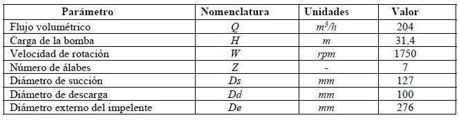 En la tabla 1, presentan las dimensiones y parámetros de la bomba centrífuga objeto de la simulación numérica, la bomba centrífuga BSC 200-30 que se trata de una bomba de simple succión con impelente cerrado, con caudal nominal de 204 m3/h y carga de 31.4 m a 1750 RPM, con álabes curvados hacia atrás.