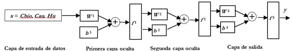 Para las dos capas ocultas la cantidad de nodos se estableció por prueba y error, según el plan experimental señalado, para modelar las variables de salida y =(Ef, Tzp, MG y PCG), con el objetivo del máximo valor del coeficiente de regresión R. En la figura 2, se muestra gráficamente la estructura de la red finalmente obtenida.