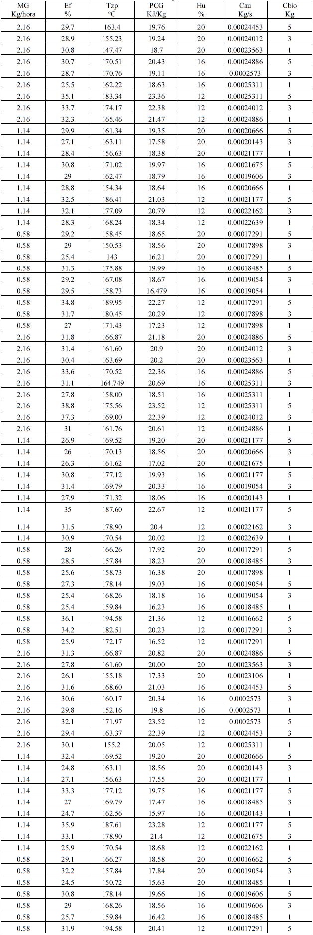 Con el fin de identificar las relaciones derivadas del análisis externo, se concibió un plan experimental con una estructura 3N (alto, medio y bajo, por variables) con tres réplicas, que permitan reflejar los errores casuales, incluyendo los errores de medición, para biomasas con bajo, medio y alto poder calórico. Para bajo poder calórico fue seleccionado el EichhorniaCrassipes, objeto de identificación en el presente artículo. Fueron también identificadas las relaciones correspondientes a otras biomasas, pero su exposición se escapa del alcance del presente artículo. Se seleccionaron los niveles, para las variables de coordinación y de decisión, de: 12 %, 16 %, 20 % (para Hu); 1 kg, 3 kg, 5 kg (paraCbio); 0.0001666 kg/s, 0.0002098 kg/s, 0.0002531 kg/s (para Cau). Los datos obtenidos se muestran en la tabla 1. Para la recopilación automatizada de la información experimental, se utilizó una tarjeta de adquisición de datos myRIO y la interface máquina hombre con un programa desarrollado en LabView. En la tabla 2, se muestran los resultados experimentales obtenidos.