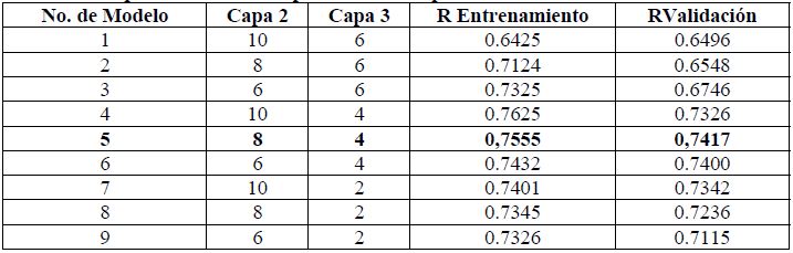 Para el entrenamiento, los datos se seleccionaron aleatoriamente en cada corrida. Se adoptó el 30% para la validación y el 70% para el entrenamiento de la red neuronal. Como resultado, se estructuraron redes con 1 y 2 capas ocultas. En todos los casos resultó más efectiva la estructura de dos capas ocultas, con funciones de trasferencia tangente sigmoidal.