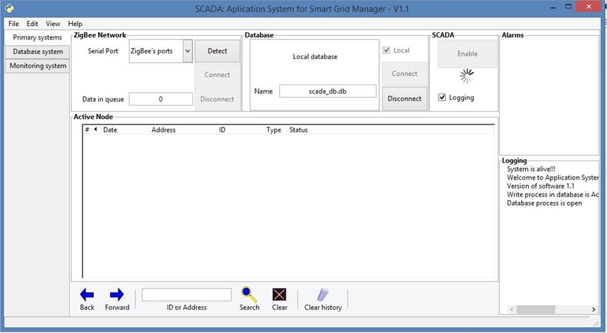 El panel izquierdo se encarga de la activación/desactivación de la red de comunicación por el protocolo ZigBee, la base de datos y la supervisión. Como el módulo de comunicaciones puede variar su localización en los puertos del servidor, se incorporó una función de escaneo y detección de dicho modulo. Una vez detectado y seleccionado en la lista desplegable, solo es necesario activar el funcionamiento de la red. Los mensajes de alerta e informativos son mostrados en el panel derecho.