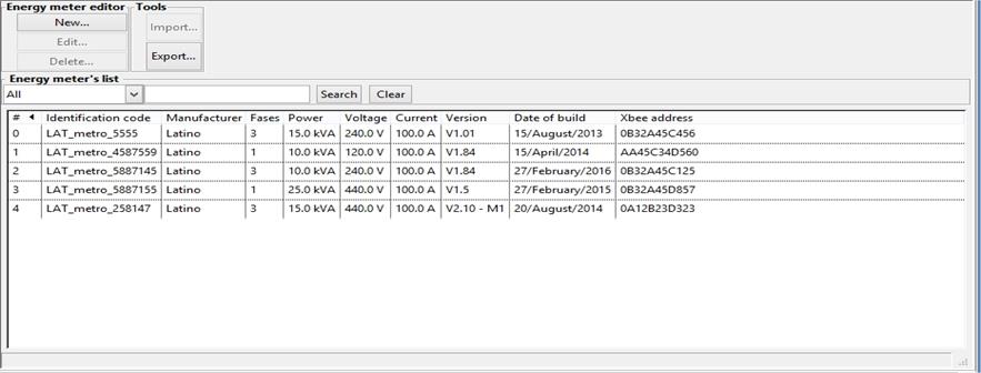 En la figura 7, se puede apreciar la sección de la ventana gráfica donde se encuentra la administración de los medidores inteligentes pertenecientes al sistema de supervisión. La función es la de incorporar, editar y borrar las especificaciones técnicas de los medidores. También es posible filtrar los resultados de la base de datos en cuanto a los medidores. Es posible exportar los resultados de la búsqueda e importar datos de configuración de un medidor en específico.