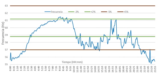 A continuación, puede verificarse este hecho en la figura 1, con el comportamiento de la frecuencia eléctrica generada por una micro hidroeléctrica aislada en un día típico.
