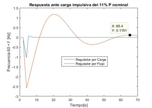 La figura 4, muestra el comportamiento de la frecuencia de la tensión generada ante un cambio de carga del tipo impulsiva. En la figura 4.a), se presenta la respuesta con los reguladores de carga y flujo actuando de forma independiente; así como, la figura 4.b), muestra el comportamiento de la frecuencia cuando actúa el regulador combinado flujo-carga. Con magnitudes de perturbación del tipo impulsiva de hasta un 11% de la potencia nominal (casos 1 y 2), el regulador por carga logra estabilizar la frecuencia en 3 s; podría considerarse casi instantáneo si se compara con los 60 s del regulador por flujo. Por encima del 11% las variaciones de frecuencia son mayores de 1 Hz por lo que estarían fuera de la norma considerada. La rapidez del regulador por carga hace que para los casos 1 y 2 domine su respuesta en la acción combinada; sin embargo, desde la perspectiva del uso racional de la energía, es un método poco eficiente cuanto mayor sea el valor de la carga secundaria instalada.