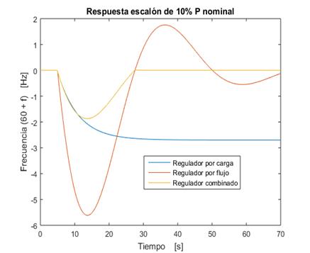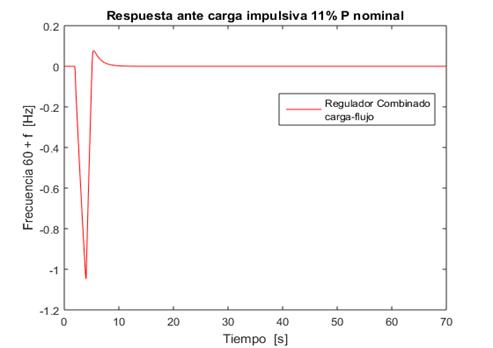 La magnitud del ajuste y el valor mínimo de la potencia de la carga secundaria resistiva dependen del comportamiento que se desee del esquema combinado. En este caso, se diseña para obtener un error a régimen estacionario () de ± 1% (± 0,6 Hz), tiempo de establecimiento () menor de 60 s, máximo sobrepaso () del error de ± 1,5 Hz, de acuerdo con lo que establece la norma cubana NC62-04 [5]. Para el caso de estudio que se analiza se logra reducir la carga secundaria a un 6% de la potencia nominal como resultado de la acción combinada.