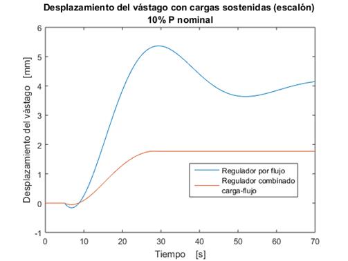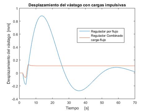 Cuando se combinan los esquemas de carga y flujo, el desplazamiento del vástago de la válvula de admisión de la turbina, ante perturbaciones del tipo impulsivas (casos 1 y 2), se reduce considerablemente como muestra la figura 6.a). Si se compara con la regulación por flujo (color azul), la acción combinada (color rojo) reduce el tiempo de establecimiento y el sobrepaso en 4 y 3,2 veces respectivamente (figura 6.a) y 6.b)). Para perturbaciones de carga sostenidas (casos 3 y 4), la pendiente con que se realiza el desplazamiento de la válvula es menor, lo que propicia una acción más “suave” y físicamente realizable. Esto contribuye a evitar los cierres bruscos y sus consecuencias indeseables.