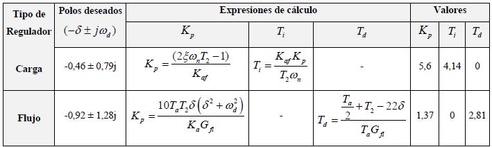 Los polos están relacionados con el factor de amortiguamiento (), tiempo de establecimiento () y máximo sobrepaso () para un sistema sub-amortiguado (). Igualando el polinomio característico de la función de transferencia a lazo cerrado para el regulador por carga y para el regulador por flujo, con el polinomio deseado correspondiente, se obtienen las expresiones de las constantes de tiempo del regulador PI y el regulador PD mostradas en la tabla 1.