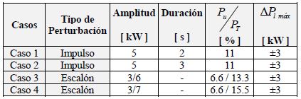 La tabla 2, muestra los tipos, magnitudes y tiempo en que actúan las perturbaciones simuladas.