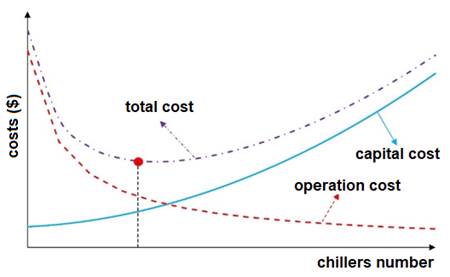 That increase in equal capacity chillers in a plant benefits efficiency increase in and energy consumption decrease was showed by [18]. On the other hand, that large capacity plant must contain at least three chillers was reported by [19]. However, space-related limitations may affect the decision. In addition, plant total cost is another influence factor, see figure 1. This may be due to the increase in the rest of the elements that constitute it, for example, pumps, pipes, among others.