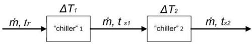 The same flow of ice water circulates through the chillers with series configuration (see figure 2). High temperature difference values are achieved between the outlet and the return of the ice water. From the thermodynamic point of view, intermediate fluids properties do not influence total system load. Mass flow of ice water, the return and supply temperatures of ice water are represented in figure by ṁ(kg/s), Tr and Ts (oC), respectively and ΔT is the temperature difference between them.