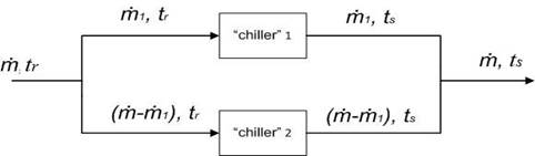 Mass flow of the primary circuit of the plant is divided into two or more parallel flows, with one mass flow (ṁ1) and the other (ṁ-ṁ1). From the hydraulic point of view, this arrangement has the advantage that the pressure drops through the pipes are not as high as in the case of series-connected chillers. The pumping system can be designed in different ways. In constant flow chillers, they may have only one pump in the circuit; the disadvantage lies in mixing of currents when one machine is out of service, which causes ice water temperature increase at the evaporator inlet. As solution, valves can be used to isolate chiller circuit off and increase the flow in operating machine. Another solution is to use multiple pumps, one for each chiller.