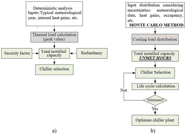 Considerations that have been previously analyzed in the design of the chiller plants is summarized by typical design as it can be seen in figure 4. Moreover, nominal capacity of each chiller is determined mainly according to the experience of the engineers or by the empirical rules. In addition, the analysis of its operation is carried out considering certain design state, generally critical working conditions. Robust design concept, figure 4 b), is begun to apply in the chiller plants design analysis from the research presented by the authors [4,30,31]. According to them, the objective of robust design is each optimal system design based on cost and effectiveness, which provides the ability to operate as efficiently as possible in all subjected operating conditions, particularly those of partial load. Optimal design will be obtained through achieving the ability to accommodate the load uncertainties and operating system reliability. The evolution of this new form of design is detailed below.