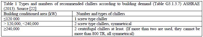 At present, load distribution between chillers is carried out through recommendations, resulting very limited this field of study. For example, use of symmetric chillers, as can be seen in table 1. is recommended by ASHRAE 90.1-2013 standard [22]. On the other hand, that in buildings with a cold demand between 1050-7032 kW, should be used between 4-8 symmetric chillers is referred as policy by [23]. Similar statement is made by [9].