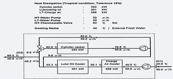 Como se puede observar en el diagrama de cálculo térmico del motor, figura 1, la mayor parte del calor se disipa en el enfriador del aire de carga con 588 kW por eso la importancia de su limpieza y sobre todo que el agua le entre al motor con una temperatura no mayor de 8 ºC - 10 ºC por encima de la temperatura ambiente.