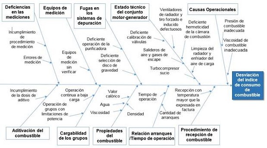 RESUMEN: El trabajo tuvo como objetivo analizar las causas de la desviación del índice de consumo de combustible de los generadores Hyundai 1,7 MW. Los métodos utilizados fueron consulta de expertos, el método hipotético deductivo para la confección del diagrama de Ishikawa así como el método estadístico de análisis de componentes principales para la determinación de la influencia del porciento de producción de lodo contra consumo de fuel en el consumo. El principal resultado es la demostración de la contribución del porciento de producción de lodo contra consumo de combustible fuel, la variabilidad de la desviación del índice de consumo, la influencia de las condiciones ambientales y de la eficiencia del radiador, así como de la presión de combustible en la potencia del motor. Con el control de la producción de lodo, la presión de combustible y la eficiencia de los radiadores se pueden disminuir el índice de consumo de combustible.