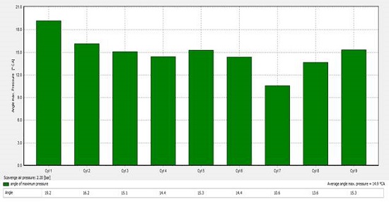En la figura 3, se muestran los ángulos de presión máxima cuando se genera con diésel a baja presión, se puede observar que oscila entre 14-19 ° cuando debe de estar por los 12,8 - 13,5°. Esto nos indica que la presión máxima se alcanza 14-19°después de que el pistón pasa por el punto muerto superior, hay combustible que no se quema dentro de la cámara de combustión, se va quemando en su recorrido por el múltiple de escape. La combustión es incompleta, provoca altas temperaturas de los cilindros, así como humo negro en las chimeneas y alto contenido de monóxido de carbón, afectando la potencia del motor y así mismo el índice de consumo de combustible.
