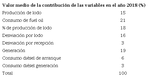 Con el empleo de la técnica estadística de Análisis de Componentes Principales se puede determinar la influencia del porciento de producción de lodo contra consumo de combustible fuel, la producción de lodo y la desviación por lodo, descartando el consumo de fuel oil y la generación, en la variabilidad de la desviación del índice de consumo, resultado que se diferencia de lo expuesto por [2], pues en su trabajo no tiene en cuenta las perdidas en los sistemas de purificación del combustible.