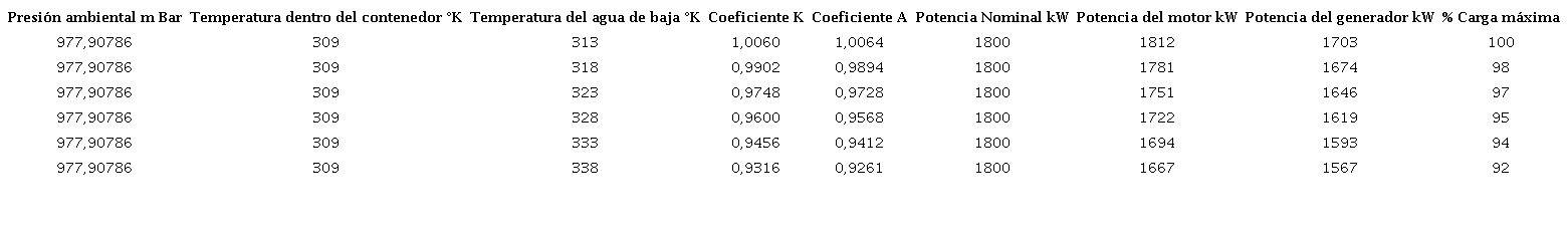 De la tabla anterior se deduce que cuando la temperatura del agua a la entrada al motor aumenta por causa de la disminución de la eficiencia del radiador ya sea por suciedad o por falta de algún ventilador la potencia del motor se ve afectada y con ello el índice de consumo de combustible. Lo mismo ocurre al aumentar la temperatura dentro del contenedor, ya sea por aumento de la temperatura del medio ambiente o por falta de algún ventilador de tiro forzado o inducido del contenedor.