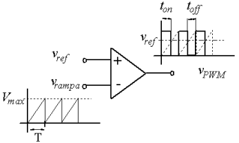 The variable control to regulate the output voltage is controlled switching pattern switch. Being based strategy toggle switch at a fixed frequency varied only time activation thereof: strategy PWM (Pulse Width Modulation). This strategy can be implemented by comparing a saw tooth signal (Vramp) fixed frequency (f) and Vmax peak voltage with a reference voltage (Vref) to achieve the driving voltage (Vpwm), see figure 2, note that you should always meet 0 ≤ Vref ≤ Vmax.