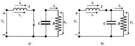 The technique used for the inverter model is based on state space, and define two operating conditions of the active switch Q: ON (μ = 1) and OFF (μ = 0). Then, 2 states are taken in: inductor current iL and the output voltage v0 (which also represents the voltage on the capacitor). Equivalent operating conditions for both circuits are shown in figure 4, note that modes of operation are derived from figure 1.