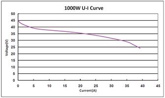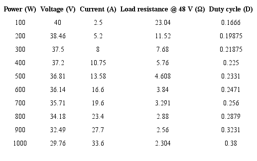 To determine the capacity values for the capacitor (C) and the inductor (L), you must know the device where the converter is used, in this case a fuel cell whose behavior is plotted in the figures below. In which the voltage-current curves (VI), figure 5, and power-current (PI), figure 6, which we can obtain information about the maximum and minimum voltages required by the fuel cell are observed and behavior at the point of maximum power, with which controller design will also, shows some data for certain powers in the fuel cell and operating parameters such as the duty cycle D.