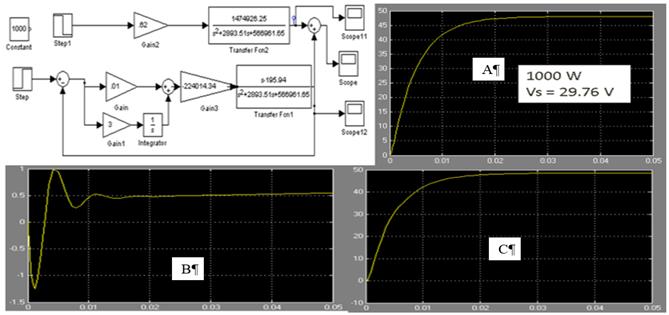 For practical considerations simulations were performed selecting Kp=0.01 and K=3 values. To which the response was simulated in transferring load when the load requires a power of 1000 W.