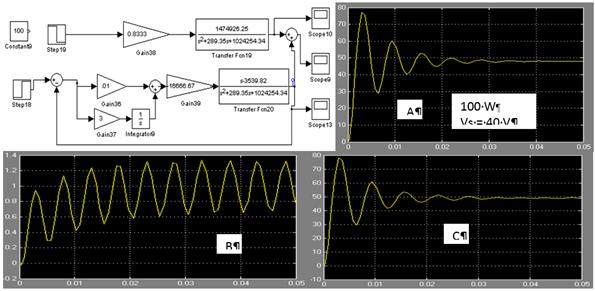 Using MATLAB SIMULINK program is possible to determine the behavior of the signal at the output of the controller, where figure 7, shows the behavior of the boost converter by including transfer functions shown above, plus constants PI control before included described, where it can be seen that at high power (1000 W) the system is not disturbed clearly because the need to adjust the system output control is not great, otherwise what is observed in figure 8, where low power (100 W) the system has a greater variation because the control affects the system output attenuating the higher pulse system.