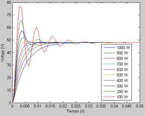 While in figure 9, shows that each which decreases the charging power to boost converter, the system changes from a system critically damped to an underdamped system, because when the system requires less power the given by the duty cycle time is shortened, causing the energy stored in the capacitor is discharged very slowly, so that it stays with or excess voltage causing an overvoltage, but regardless of this time in which it has the surge is very low and the system at the end of 0.05 seconds ends regulated voltage at 48 V desired.