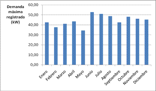 Para la caracterización del consumo de electricidad del Centro Nacional de Electromagnetismo Aplicado (CNEA), se utiliza la máxima demanda registrada día, porque en este indicador se unifican, la cantidad de carga (equipos, luminarias, etc.), el factor de coincidencia (equipos conectados simultáneamente) y el régimen de trabajo de los mismos. Para el estudio se utilizó como fuente de información primaria la factura eléctrica, de forma específica el dato relacionado con la demanda máxima registrada día, se calculó el promedio por mes, figura 1, de la misma se observa que la mayor demanda promedio se alcanza en el mes de junio, 52,67kW.