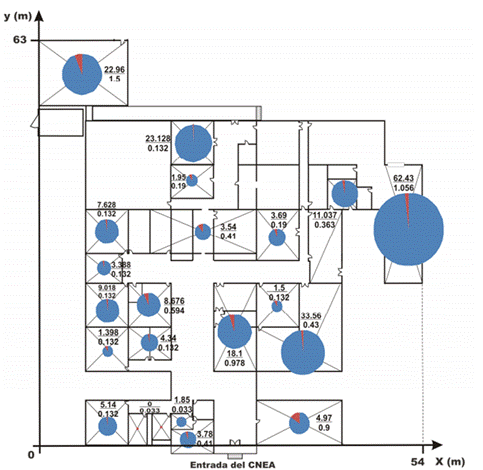 Es necesario señalar que la máxima demanda registrada correspondió al mes de junio del año 2016, con un valor de 59kW. Se pudiera agregar que los máximos valores obtenidos en este gráfico pertenecen a los meses del verano, por lo que este consumo está estrechamente relacionado con la refrigeración y con el desarrollo de las tesis de diploma. Para caracterizar la carga de iluminación y fuerza, se empleó un cartograma de cargas porque a través de este, se informa la estructura de la carga en cada área de la organización de forma rápida y simple. Las cargas se representan en círculos, los cuales se dividen en sectores coincidentes con las cargas de fuerza (color azul) y de iluminación (color rojo), como se muestra en la figura 2.