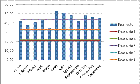 Se comparan los valores de la potencia generada para cada uno de los escenarios identificados con las demandas registrada día mensual, figura 4. Se aprecia que la potencia generada, por los escenarios de forma individual, no satisfacen la demanda día registrada; sin embargo esto se podría lograr utilizando varios escenarios a la vez.