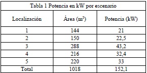 Para calcular el potencial para la generación de electricidad, por cada escenario identificado, se toma como referencia que: el número de horas de irradiación solar constante es hipotéticamente 1000 kW/m2 [10]. Esto significa que una hora solar pico (HPS, por sus siglas en inglés) equivale a 1 Kwh/m2 o a 3,6 MJ/m2. En Cuba se comercializan paneles solares que generan 150 W/m2, por lo que se utiliza este factor para el cálculo de la potencia por área en cada escenario según la ecuación (1).