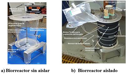 El equipamiento para el desarrollo del experimento consta de 6 biorreactores de mezcla completa de forma cilíndrica con bridas ciegas en la parte superior e inferior, que se muestran en la figura 1, cuyos cilindros son de acrílico transparente, como se observa en la parte a) de la figura, de 13.97 cm de diámetro interno (5,5”) y 40 cm de alto (16”). Cuyo volumen total es de 6,131 litros y un volumen de proceso de 5,5 litros. En la brida ciega superior se encuentran anclado el motor (CA 127 Volts, 6 rpm y 3 Watts) que mueve la flecha del agitador introducida por un orificio en la misma, al igual que la válvula de salida del biogás producido que se capta en bolsas tedlar, que se observa en la parte b) de la figura 1. En la brida ciega inferior se encuentra colocado el soporte para la flecha del agitador.