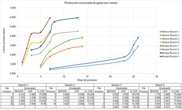 La producción de gases sólo se dio en los reactores 1, 2, 5 y 6; toda vez que en los reactores 3 y 4 se encontró un punto de inhibición del proceso. En la figura 4, se muestra la producción acumulada de biogás y metano con su porcentaje dentro del biogás; la figura 5, muestra las producciones acumuladas de biogás y metano, de metano por kilogramo de sólidos totales y volátiles, tanto introducidos como agotados. En virtud de que el porcentaje promedio del metano contenido en el biogás producido por los reactores es del 75,78 % y que el poder calorífico del metano es de 9.500 Kcal/ m³; para efectos de este trabajo, se considera que el poder calorífico del biogás es de 7.199 Kcal/ m³ [15].