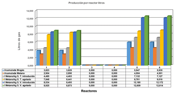 Sin embargo, los reactores 5 y 6 incrementaron el rendimiento al existir en el reactor 5 una remoción del 81,40 % de sólidos totales (514,07 g) y el 96,60 % (357,21 g) de sólidos volátiles, con una producción de 5,947 l de biogás conteniendo el 75,74 % de metano (4,504 l) y, en el reactor 6 una remoción del 79,05 % de sólidos totales (499,23 g) y el 96,50 % de sólidos volátiles (356,83 g) con una producción de 5,935 l de biogás con un contenido de metano del 75,84 % (4,501 l); con un TR de 13 días para el reactor 5 y 7 días para el reactor 5, lo que significan un TR 6 días menor, lo que representa el 85,71 %.