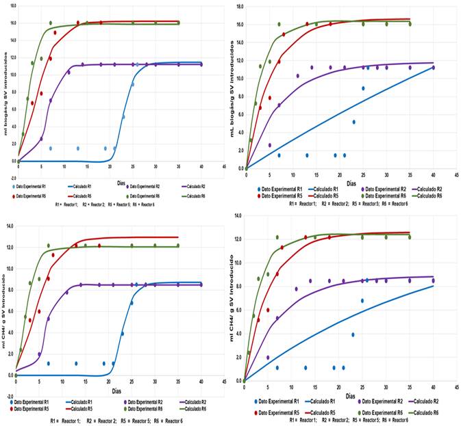 Considerando que el objetivo fundamental de la Codigestión anaerobia es agotar los sólidos volátiles introducidos al proceso; utilizándo los resultados experimentales de la producción en ml de biogás y metano por gr de sólidos volátiles introducidos, se simuló y comparó la acumulación de esos gases en el proceso mediante los modelos Modificado de Gompertz que se representa por la ecuación (3) y Cinético de Primer Orden de la ecuación (4), determinándose los parámetros de los modelos mediante regresiones no lineales.
