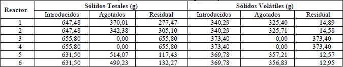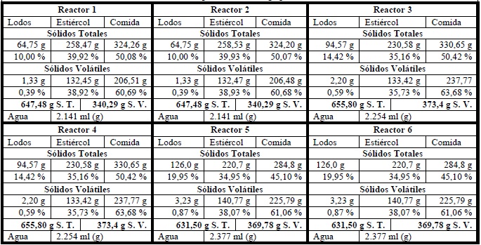 Los diferentes reactores se cargaron con 5,100 kg de carga total de proceso; que corresponden a 12,70 % de sólidos totales para los reactores 1 y 2; 12,86 % para los reactores 3 y 4; y 12,38 % para los reactores 5 y 6.