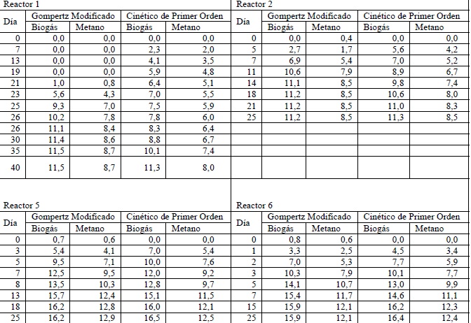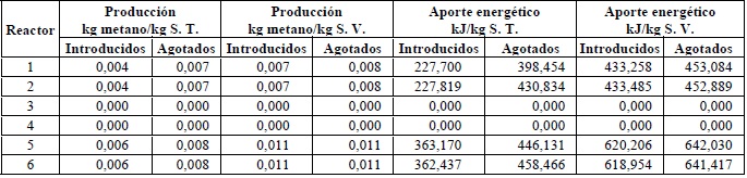 Con la producción de metano en kilogramos y utilizando su poder calorífico de 58787 kJ/kg, mediante la ecuación (2), se obtiene el aporte energético de cada reactor por la producción de ese gas, que se muestran en la tabla 3.