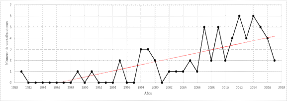 La figura 1, muestra que existe una tendencia al incremento en las investigaciones relacionadas con la difusión de las TER. Esta tendencia es más marcada a partir del primer quinquenio del presente siglo.