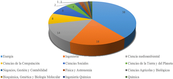 En la figura 2, se ilustra la distribución de las publicaciones científicas relacionadas con la temática tratada, por diferentes áreas o líneas de investigación. Las contribuciones más socializadas se enfocan en líneas como la energía, la ingeniería y el medioambiente.