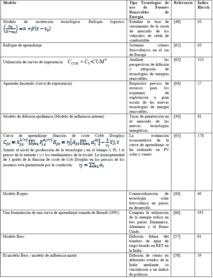 La tabla 1, muestra un compendio de las investigaciones más populares, que adoptaron el modelo de difusión como una herramienta para analizar la propagación de las TER. Las aplicaciones de modelos de difusión existentes en el contexto del análisis TER consideran dos aspectos. En primer lugar, el potencial de las TER se basa en los recursos naturales disponibles y, por tanto, tiene restricciones de oferta. En segundo lugar, los valores de los parámetros de difusión estimados a través de los modelos podrían ser una base para la comparación efectiva de los procesos de difusión.