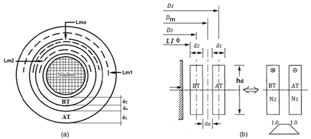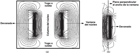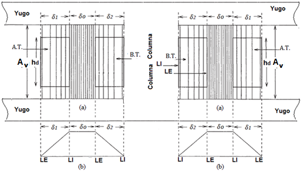 En el campo magnético de dispersión de un transformador tiene notables diferencias entre la distribución del flujo de dispersión que existe en la dirección axial de la ventana del núcleo y la que existe en la dirección perpendicular a esta. Cuando las bobinas de alta tensión (AT) y baja tensión (BT) tienen la misma altura, los amper-vueltas, se encuentran distribuidos uniformemente en la altura de los devanados, entonces el flujo de dispersión es predominantemente axial, excepto en los extremos, donde se deforma buscando el camino más corto para cerrar a través del yugo o la columna del núcleo [1 - 5]. Ver figuras 1a y 1b.