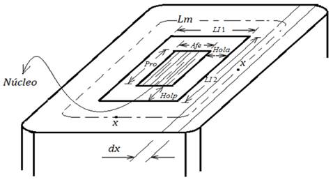 Haciendo el análisis para un trayecto cerrado de flujo a una distancia x desde el lado interior de un devanado de forma rectángular como se muestra en la figura 5, se tiene: